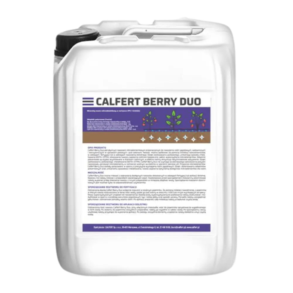 Calfert Berry Duo to płynny nawóz mikroelementowy, idealny do nawożenia roślin jagodowych, sadowniczych i warzywniczych, zarówno w uprawach polowych, jak i pod osłonami. Dzięki zastosowaniu podwójnego chelatowania (EDTA i DTPA), nawóz zapewnia szybkie i efektywne przyswajanie mikroelementów przez rośliny, które są stabilne w szerokim zakresie pH.