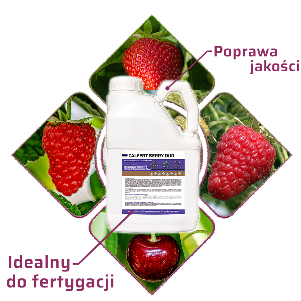 CALFERT BERRY DUO można stosować zarówno poprzez fertygację, jak i w zabiegach dolistnych. Dzięki płynnej formulacji i podwójnemu chelatowaniu mikroelementów, nawóz łatwo dopasowuje się do potrzeb różnych upraw.