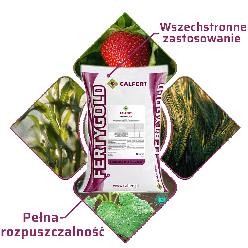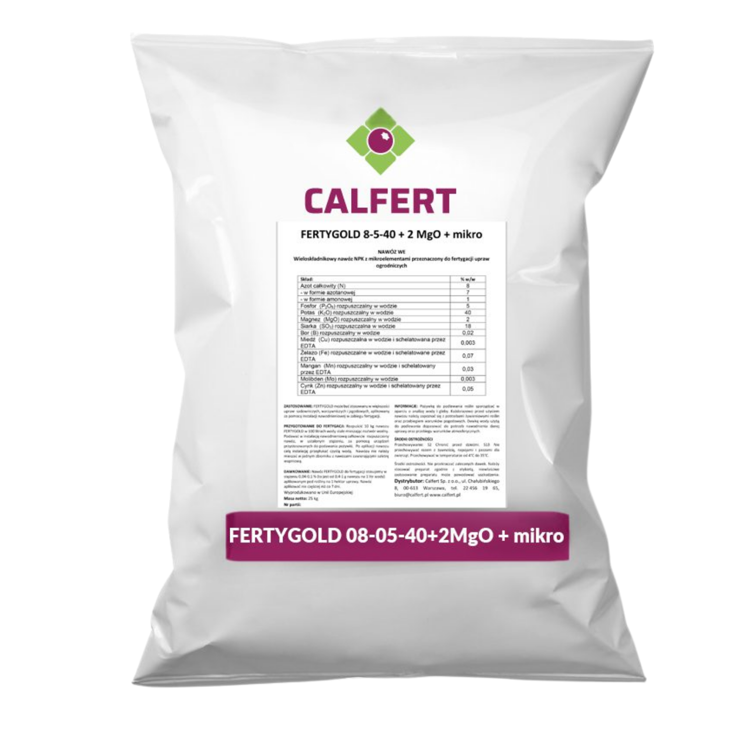 FERTYGOLD 8-5-40 + 2 MgO + mikro przeznaczony jest do fertygacji upraw sadowniczych, jagodowych i warzywniczych. Aplikowany poprzez systemy nawodnieniowe, pozwala na szybkie i skuteczne dostarczenie składników pokarmowych wprost do strefy korzeniowej roślin.