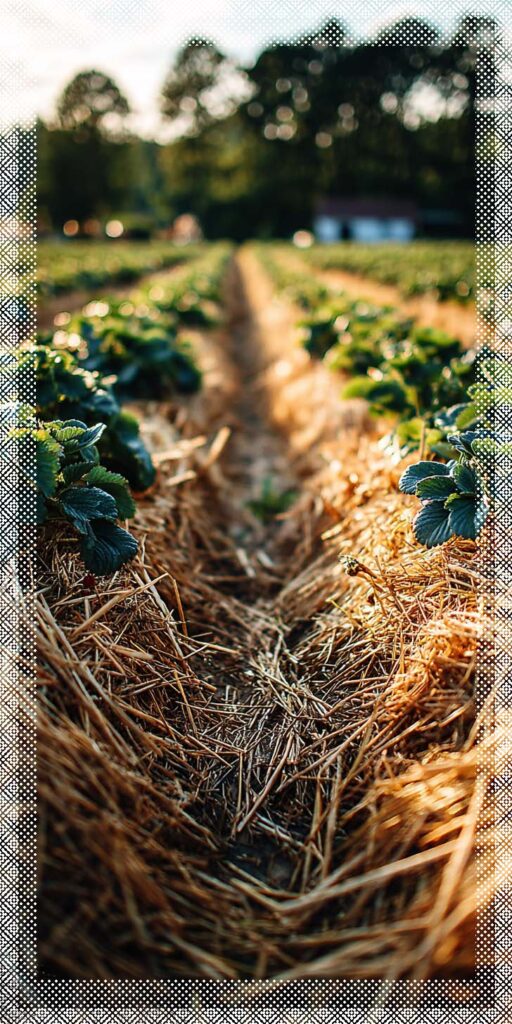 Plantacja truskawek po zbiorach owoców, rozkład i mineralizacja słomy.
